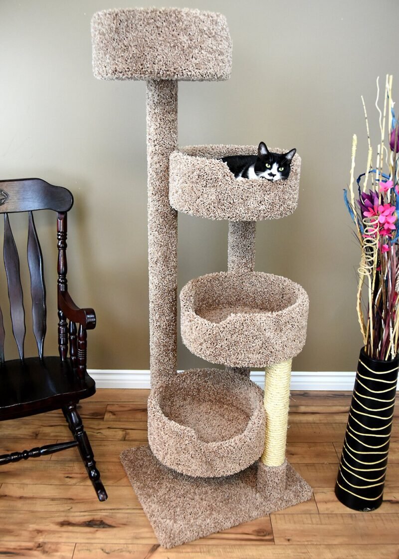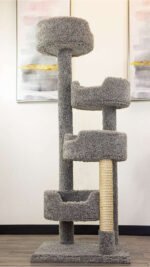 The cat condo is excited to bring to you its new cat stairway. At 64 inches tall and sturdy, this cat tower provides the perfect height for your kitties to feel like they are on top of the world. With 4 spacious perches that are easy to access, this cat tree is great for multiple cat households or your active kitty. They use high-quality materials such as wood, household carpet, and unoiled sisal rope. This cat tree will require minimal assembly and is handcrafted in the USA.