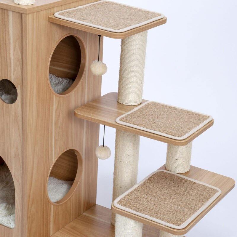 - Material of high quality – high-density veneer board, smooth and sturdy. 2 comfortable cushions inside the cat house and 3 anti-slip mats on the steps are removable and machine washable. Its heavy weight and thickened bottom plate make it more stable.