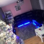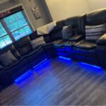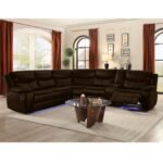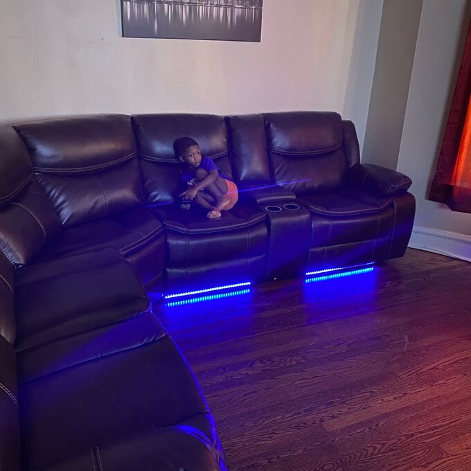 This product is made of faux leather with contrast stitching. It reclines on both ends of the sectional, also comes with a center console with two cup holders and storage for remote by lifting the console. The sectional also has LED light underneath for movie-like settings.