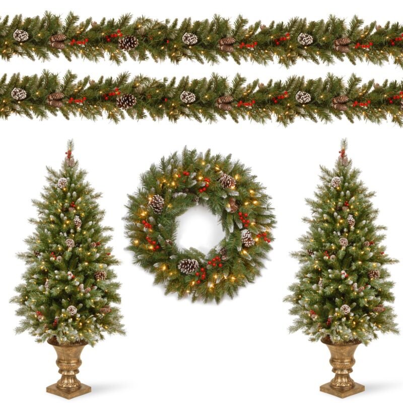 The Frosted Berry assortment features greenery items carefully selected to simplify holiday decorating by offering a package of coordinated pieces. Each item is trimmed with pine cones and has snow sprinkled branch tips. Included are two 4 ft. entrance trees each in a decorative urn base and pre-lit with 70 clear lights, perfect for doorways or hallways. Also included is a 24″ wreath pre-lit with 50 battery-operated warm white LED lights, and two 9 ft. garlands each pre-lit with 50 clear lights. The battery-operated wreath includes an integrated 6 hours ON/18 hours OFF timer. Both trees and garlands are plug-in items, only the wreath is battery operated. All pieces are rated for indoor or outdoor use.