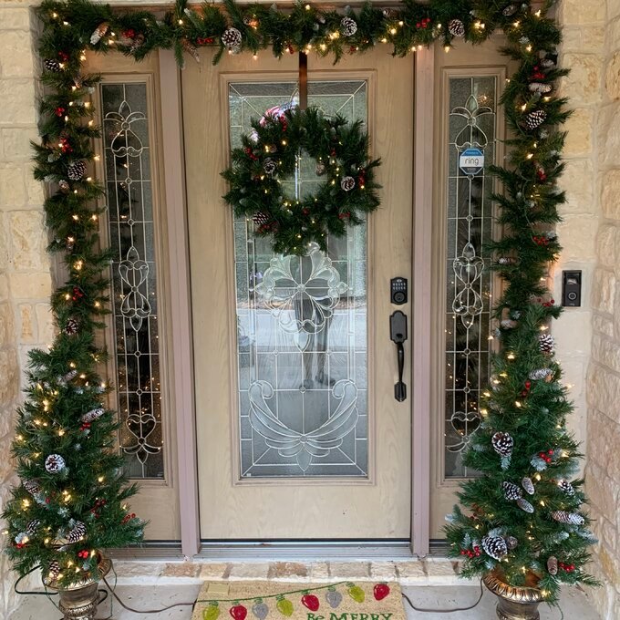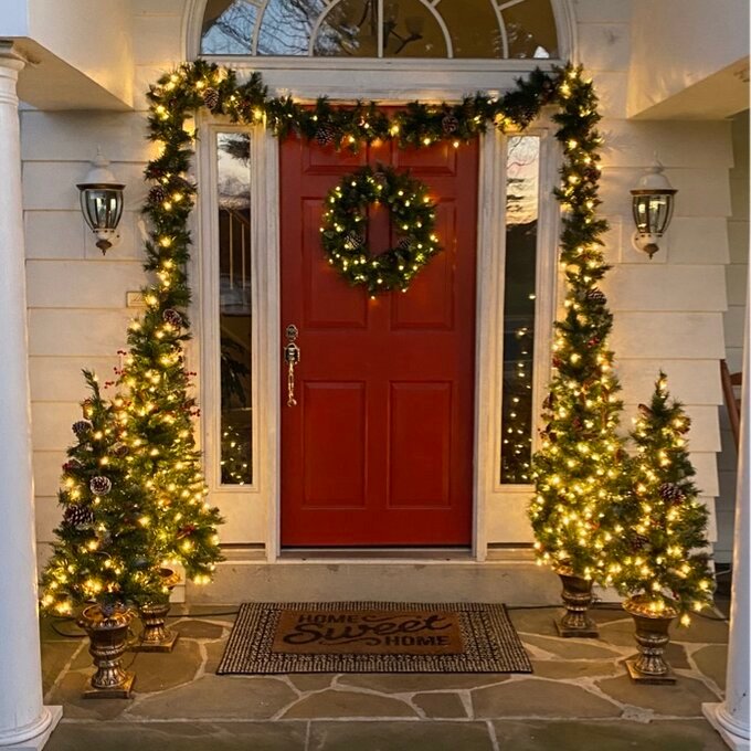 A:”This is a set with 2 entrance trees, 2 garlands and a battery operated wreath.”