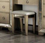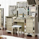 This vanity will brighten up your morning when you see your visage surrounded by its color. It is beautifully complemented by antique mirror panels inserted into every trim of the vanity set. This is what luxury feels and looks like.