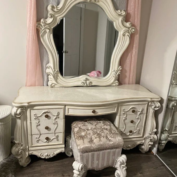 Sleeping like royalty with this collection, the Vanity Set with Mirror was inspired by old European design. This collection features a carved scrollwork accent on the headboard. The accent pieces crafted in wood features such as ample storage, beveled mirror, and brown copper finish hardware. This bedroom set will give you a royal sensation in the bedroom.