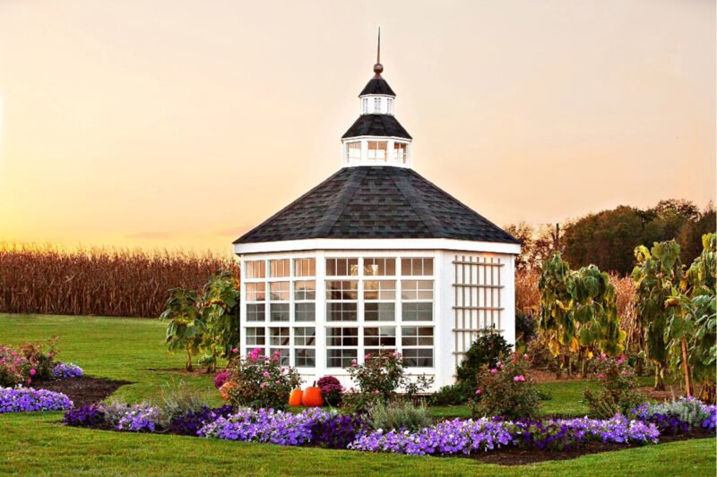 One of the most awe-inspiring designs. This 12 Ft. W x 12 Ft. Garden Shed is a part greenhouse and part garden shed. It comes with a wall separating the two. Topped off with a cupola with windows and a copper finial. This panelized kit comes primed, and ready for paint! Panelized means the 16″ o.c. walls are in prefabbed sections, everything else is pre-cut and labeled for you! NO EXTRA CUTTING! With these kits, the Floor Kit is included! The customer provides the shingles, drip edge, and paint. A manual will also be included.