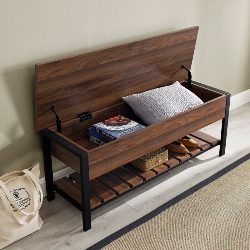 Outfit your entryway ensemble with traditional style using this versatile storage bench as your base. Crafted from a metal frame, it features a rectangular wooden seat in a natural woodgrain finish for a touch of rustic appeal. Plus, it sports a slatted shelf below for keeping a few pairs of your favorite footwear organized and out of the way. Best of all, the seat lifts reveal storage space inside to help keep clutter under control.