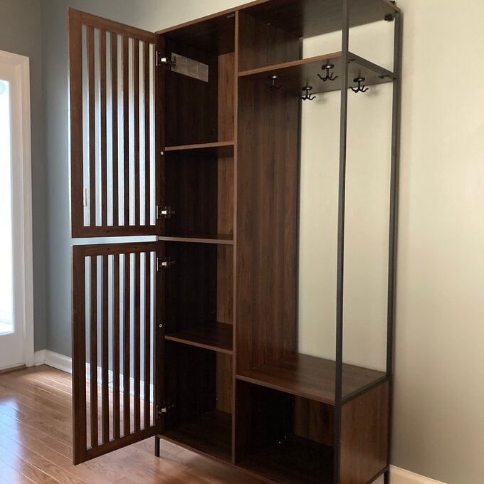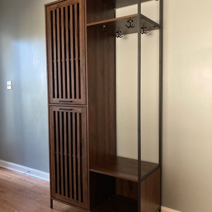 This freestanding hall tree keeps your entryway organized, and it shows off a clean-lined modern silhouette with ample room to store belongings. It’s crafted from solid and engineered wood with a two-tone finish that stands out in your space. Two left-hand cabinets with open, vertical slats offer out-of-sight storage. An upper right shelf is a great spot for bags or decor, while a bottom compartment works well as a place to tuck away shoes and boots. Four separate 4-prong hooks make it a cinch to hang up jackets and umbrellas upon entering your home. A wall anchor is also included for extra safety.