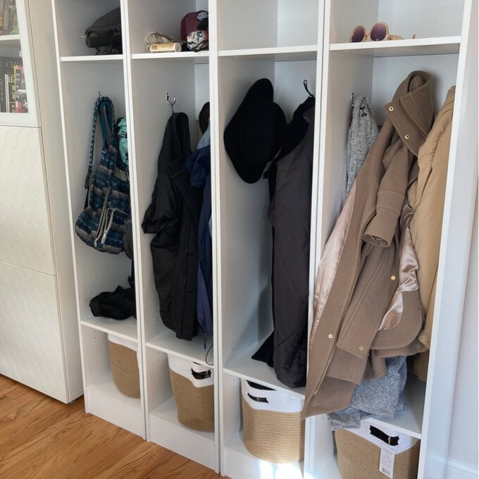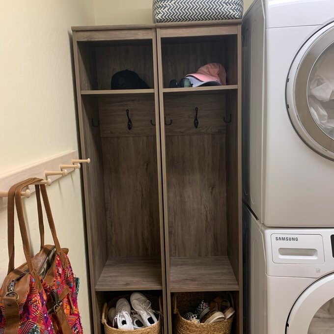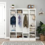 The narrow entryway organizer set is a great addition to any family room, recreation room, or mudroom. Ideal for growing families, you can use organizers individually or position them side-by-side to create a built-in look. Each organizer is designed for maximum functionality. The tall compartment is 56.5″ high and has a lower shelf that can be adjusted to eight different heights. One large double hook on the rear, reinforced panel, and a single hook on each of the side panels allow ample room for hanging items. A fixed shelf on top with an 8″ high compartment is spacious enough for decorative baskets, hats, and small bags. Each side panel has 4.75″ high cutouts to accommodate baseboards. Constructed from non-toxic, CARB-2 compliant, laminated composite woods. Ships ready to assemble includes an instruction booklet for easy assembly and has a 5-year manufacturer’s limited parts warranty.