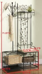 Showcasing a metal scrollwork design and open shelving, this charming hall tree marries seating and storage for a timeless centerpiece. Keep coats and scarves at the ready in the entryway, then kick off your shoes and stow them on the lower shelf.