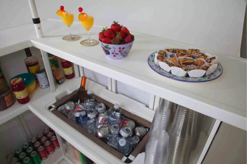 • Set Includes: Commercial grade steel L-shape frame, a drop-in cooler that holds up to 1 case of drink, a set of 4 padded barstools with custom printed covers, a palapa (tiki) umbrella, and a deluxe travel bag with wheels