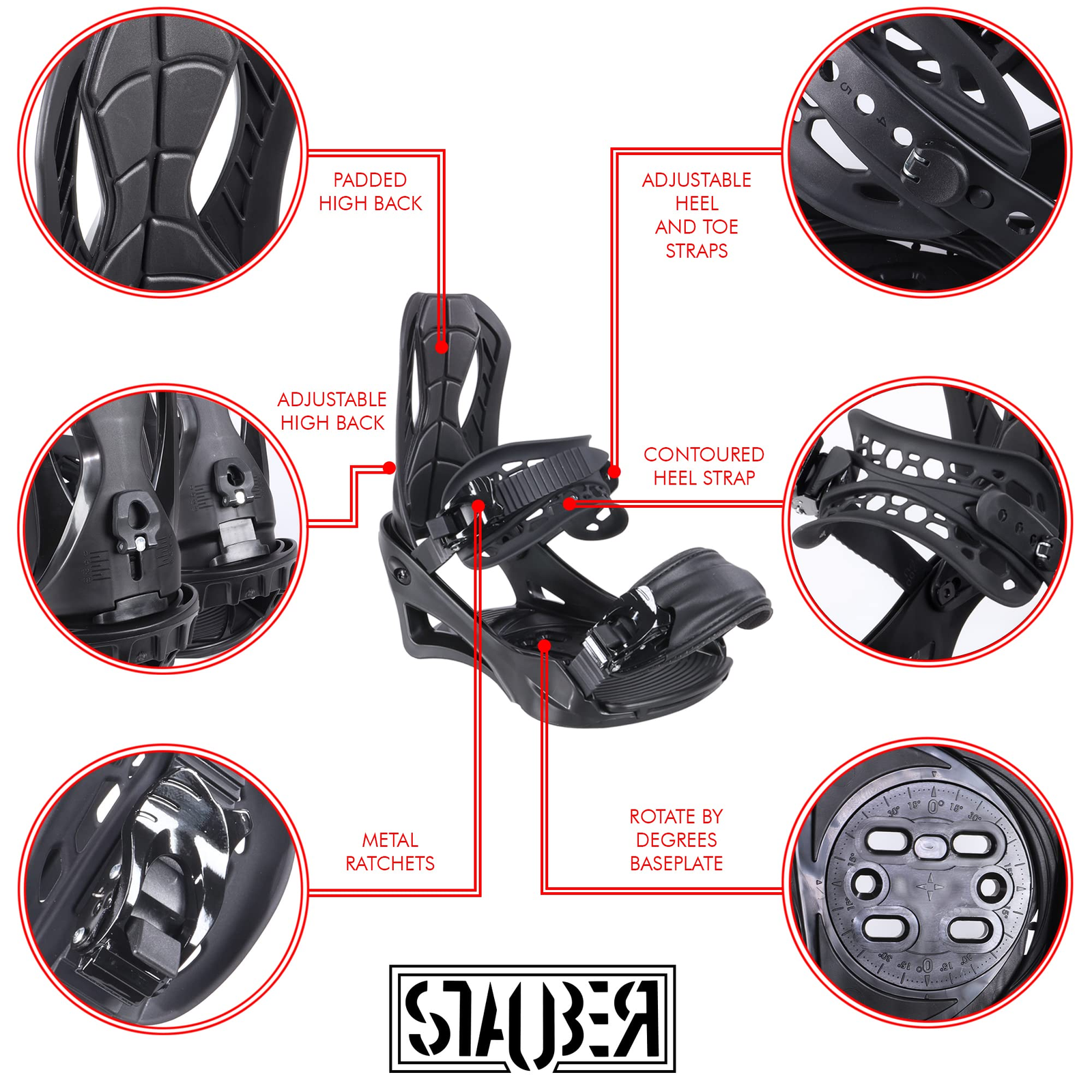 STAUBER Dyna Snowboard Bindings – Light weight, Reinforced Precision Injection Molded Bindings, Adjustable High back, Taught Ankle Strap, Toe Cap strap, Aluminum alloy 6061 Buckling mechanism
