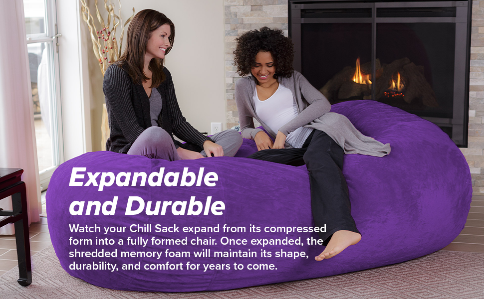 Shredded memory foam: Chill sack Bean bag chairs are stuffed with a shredded, soft, memory foam blend that is highly durable to maintain shape while increasing comfort levels for the ultimate chill moments