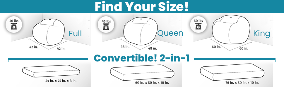 Bean bag chair seats 1 adult (42″ wide). Full bed sleeps 1 adult (54″ x 75″ x 8″).