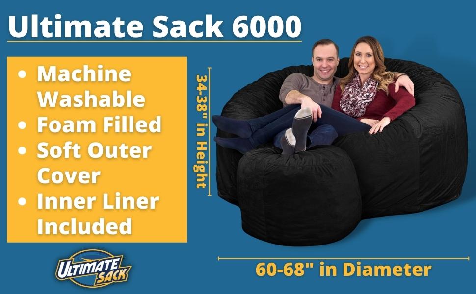ULTIMATE SACK 6000 w/ FOOTSTOOL – has material measuring approximately 6 feet in diameter. Depending on the surface of the floor and weight of the occupant, the bean bag chair will be between 60 and 68 inches across, and 34-38 inches in height when fully fluffed. The bean bag chair weights 65-70 pounds. Includes a removable, washable cover. Comes with an unbeatable 10 Year Manufacturer Warranty. Leaves Warehouse in 1-4 Days.