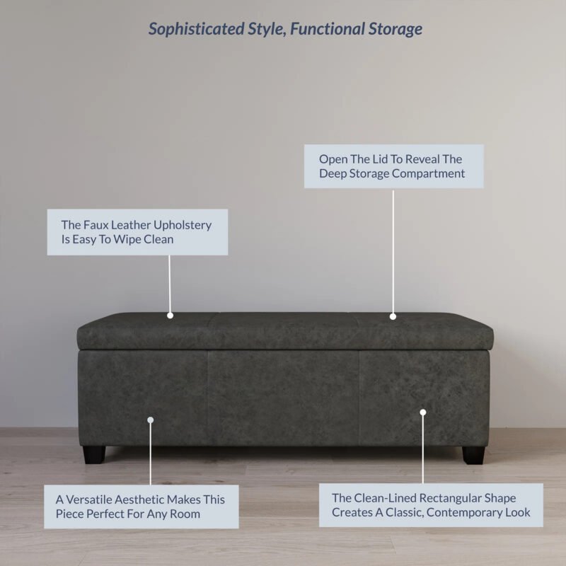 Style, seating, and storage all come together in this ottoman. A sleek silhouette with modern styling makes this ottoman a chic addition to your decor. Pair it with your living room furniture for classy accents. Its low profile and soft cushioning offer the perfect setting to kick up your feet and relax at the end of a long day. When you have guests over, this bench traditions from a footstool to a comfortable seat, augmenting the seating area in your living room.