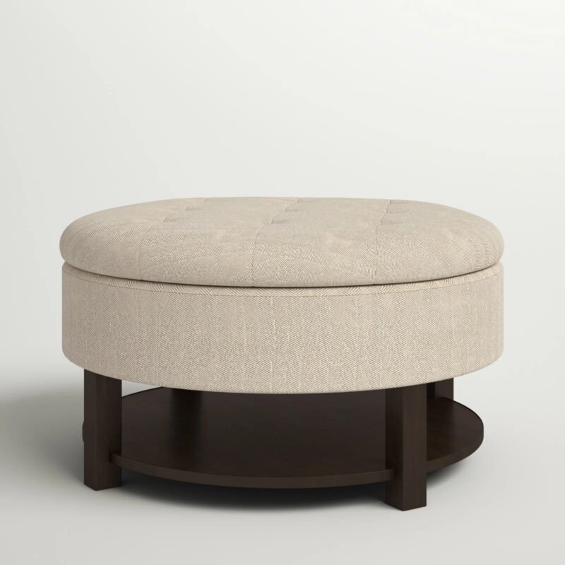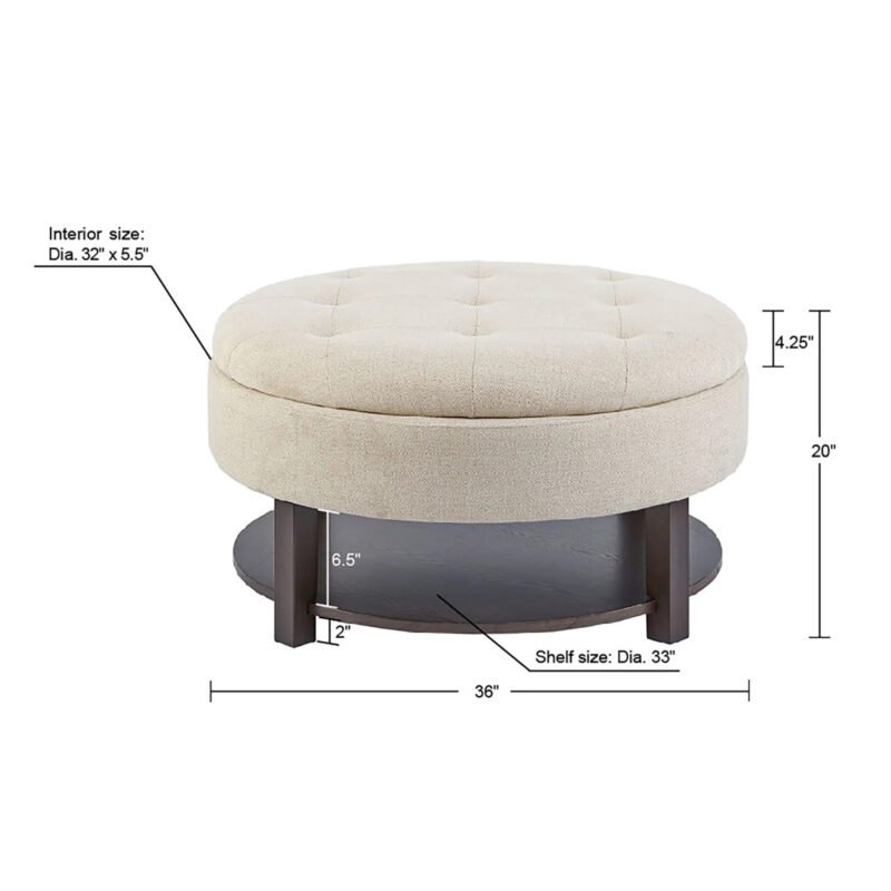 There is no need to sacrifice style for storage with this round storage ottoman. Featuring a tufted top that lifts to reveal ample interior storage space, this round ottoman centralizes the clutter and becomes a stylish addition to your living room. There is also an additional veneer shelf to store magazines and newspapers.