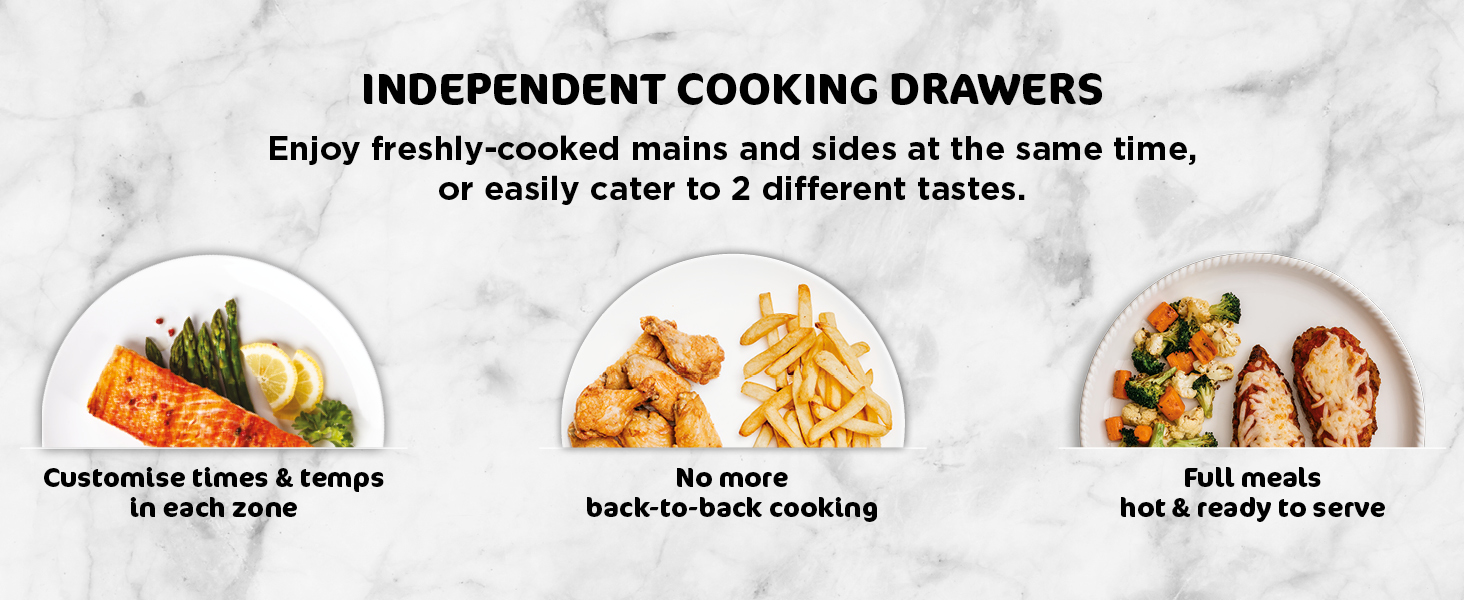 - XL CAPACITY: Feeds 8+ people. INCLUDES: 2 x 4.75L cooking drawers (9.5L total capacity), 2 x crisper plates, chef-created recipe guide. Dishwasher-safe parts.