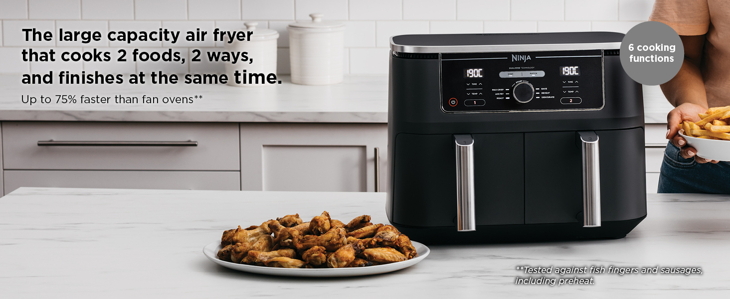 - 6 COOKING FUNCTIONS: Air Fry, Max Crisp, Roast, Bake, Reheat & Dehydrate. Up to 75% faster than fan ovens* (*Tested against fish fingers and sausages, including preheat.)