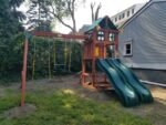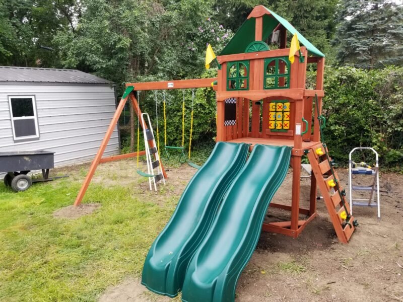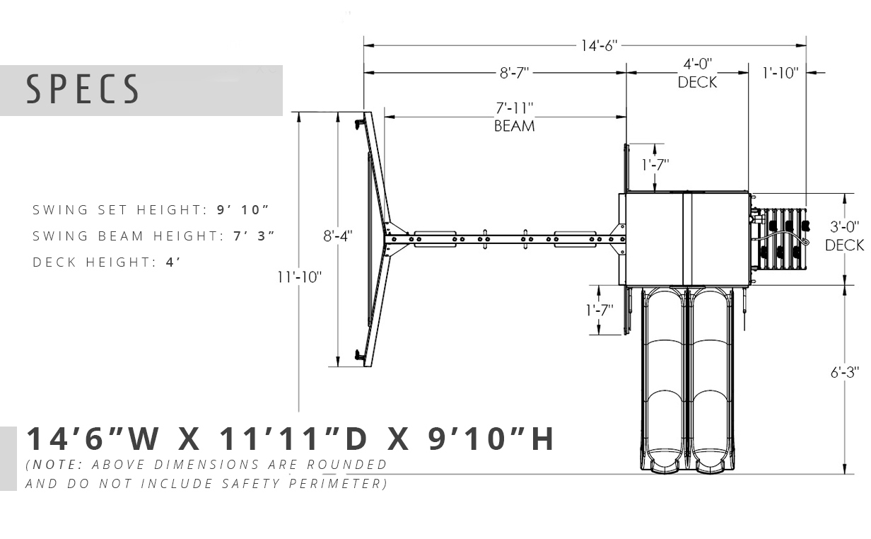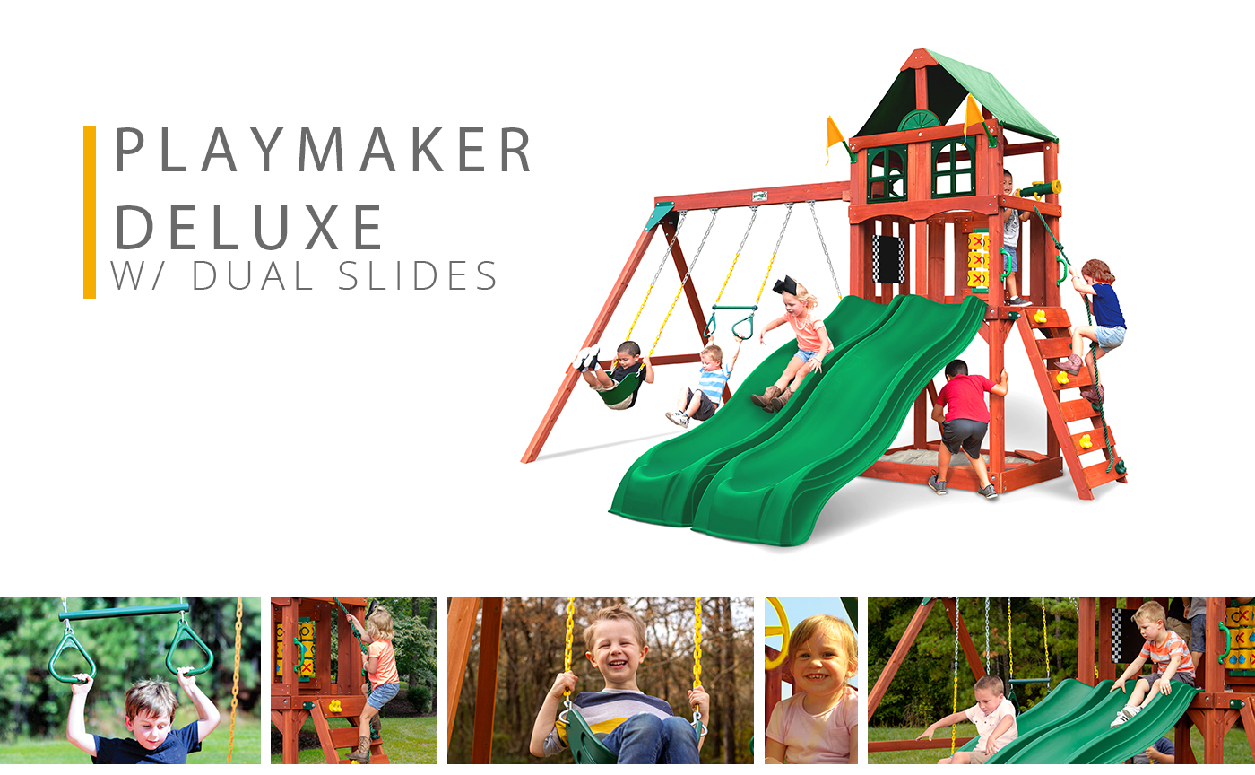 Have double the fun with the Playmaker Deluxe Wood Swing Set by Gorilla Playsets. This high-quality swing set provides hours of outdoor activities for your child to enjoy, like the rock climbing wall, the built-in sandbox area, two Alpine Wave Slides, and much more. The heavy-duty Deluxe Vinyl Canopy protects the upper play deck from the weather elements and provides shade on hot days. This outdoor playground includes all required hardware, lumber, and a fully illustrated instruction manual to ease assembly. Gorilla Playsets’ lumber comes pre-cut, pre-sanded, and pre-stained to help reduce the time of installation. The beautiful redwood stained cedar wood naturally resists rot, decay, and insect damage. The Playmaker Deluxe Swing Set meets the American Society of Testing Materials (ASTM) safety standards for residential use only.