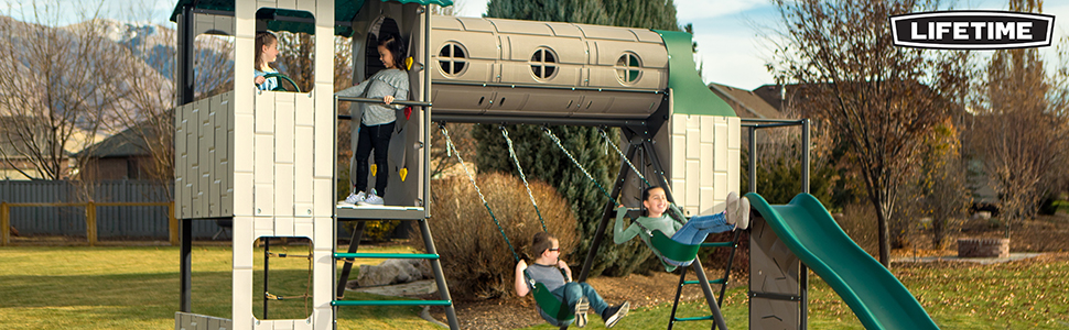 The Adventure Tunnel Playset from Lifetime Products is full of exciting activities for children ages 3-12. Constructed of UV-protected high-density polyethylene (HDPE) and powder-coated steel, it’s durable, weather-resistant, and will not warp, rot, crack, or splinter. From the swing set and slide to the adventure tunnel, your kids will have no problem finding plenty of features to keep busy with. So let your kids enjoy the features and activities while you enjoy the low-maintenance and safety of a Lifetime Playset. The Adventure Tunnel Playset comes with a club house, tunnel, swings (2), Slide, Rope Ladder, and climbing walls (3). The club house has two door openings in the top level, as well as windows in the upper and lower levels. A rope ladder and a metal ladder lead up to the clubhouse. The tunnel rests on the bar above the swings, and leads to a separate platform that houses the slide and climbing wall. Another metal ladder reaches the slide platform. Comes with a 5-year.