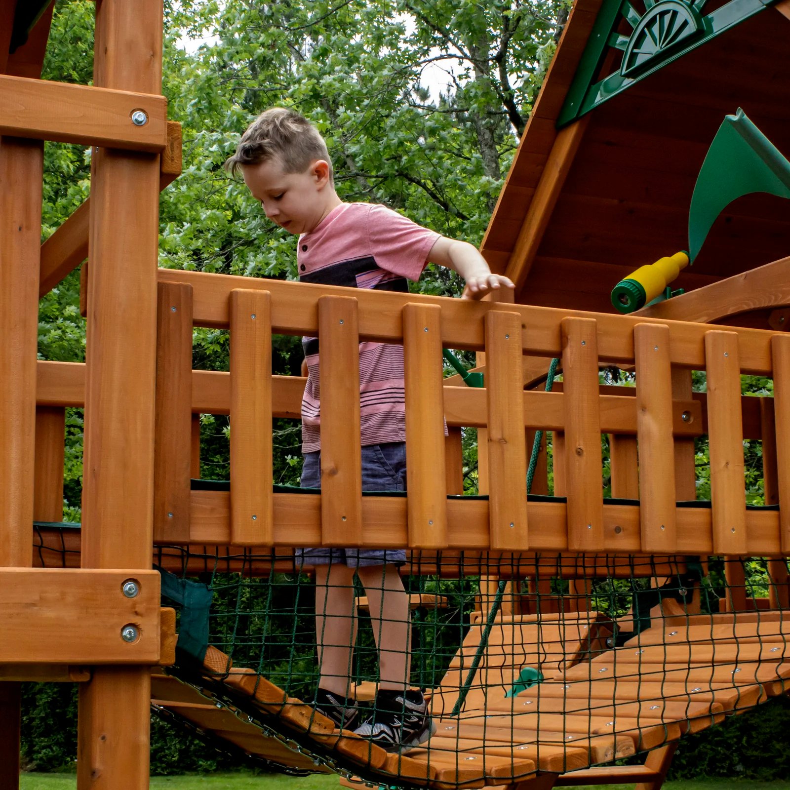 Add the Swing Set with amber posts to your yard and you’re sure to be a hit with any kid. There are many ways to get around on this set – you can climb up the rock wall, slide down the wiki wave slide™ or look out over the yard on the tower! This premium cedar wood playset is pre-cut, pre-sanded, and pre-stained in your backyard. The entire playset is finished in a beautiful amber stain. Gorilla Playsets’ cedar naturally resists rot, decay, and insect damage.