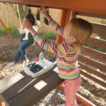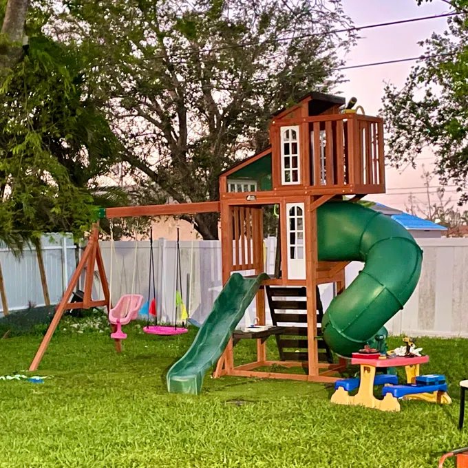 By utilizing all 360˚ of space, the KidKraft Cedar Summit Austin Swing Set/Playset provides fun up, down, and all the way around. The angled rooflines bring a new slant to play, creating a clubhouse-type vibe. Go ahead, invite friends over. With belt swings and an acrobat, there’s plenty of room to share the fun. Two slides give options on how to zip to the ground. The built-in kitchen is a cool feature that lets kids cook up more imagination. Colorful rocks adorn the climbing wall to entice kids to journey to the upper clubhouse. There, they can clamber one more level up for the ultimate view and lookout post. There’s so much to do in the Austin Swing Set that kids may never want to come inside.