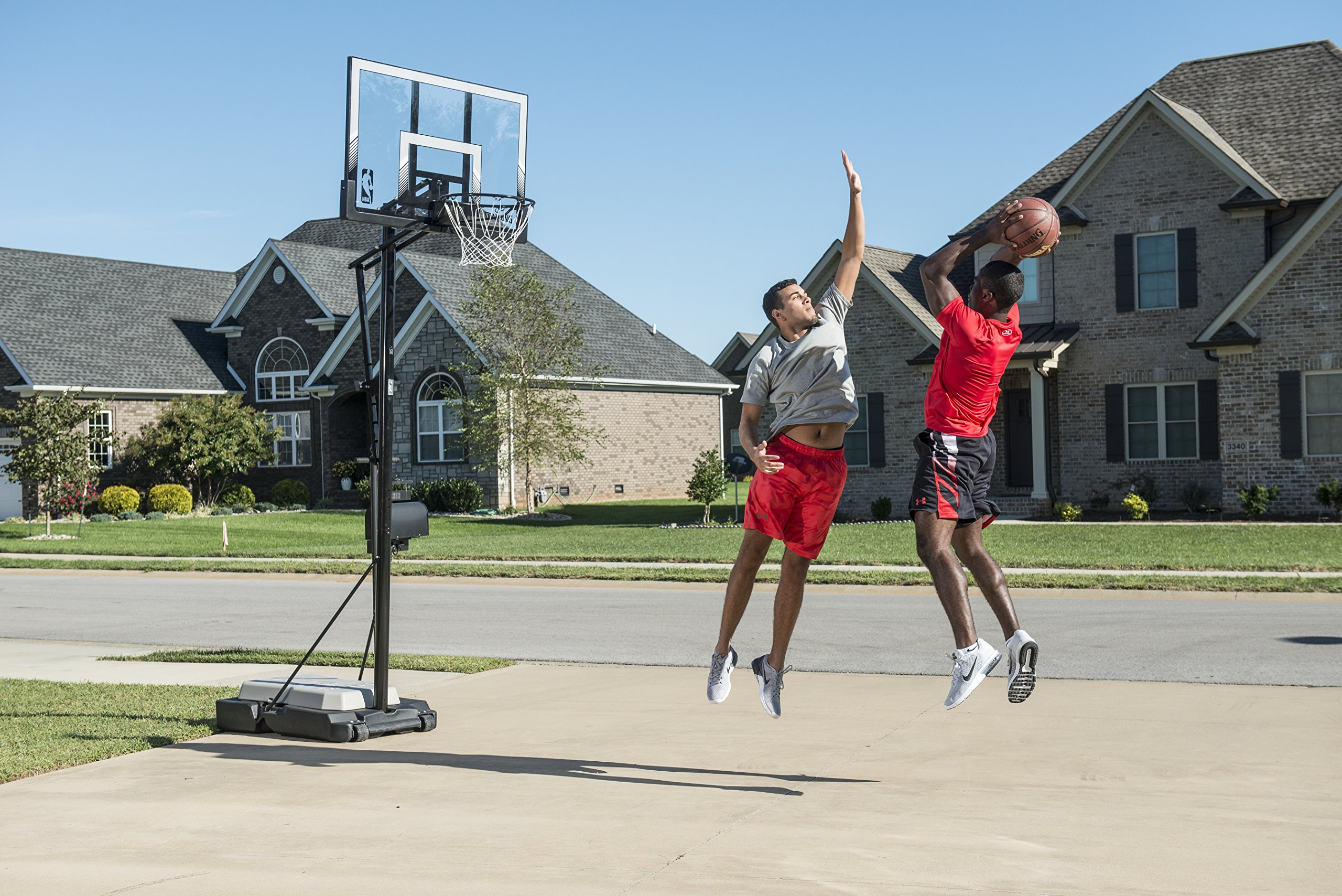 Designed for competitive level of play, the ultimate hybrid Jr portable Basketball system will transform the pavement into an arena. The hybrid base with its removable lid for easy storage access holds 11 gallons of water and 200 lbs (4ea 50lbs bag of sand) of sand or gravel. The acrylic backboard allows for fast rebounds – great for bank shots and forward players. The heavy duty Arena-Slam rim features breakaway action with steel Rams to attach the White net (included). quick glide lift system adjust rim height from 8.0″ – 10″ in 6″ increments. Other features include a three-piece, 3-Inch steel pole, and a NBA authentic style blow-molded backboard pad and NBA pole pad that provides added protection.