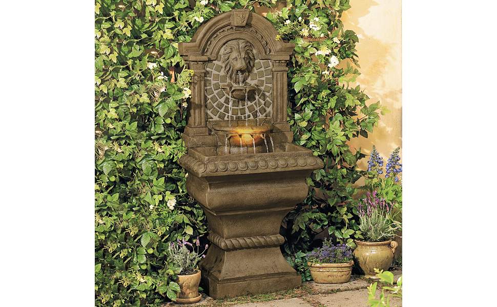 Mediterranean inspired, this traditional fountain with light features flowing water from a lion’s head into a series of basins.