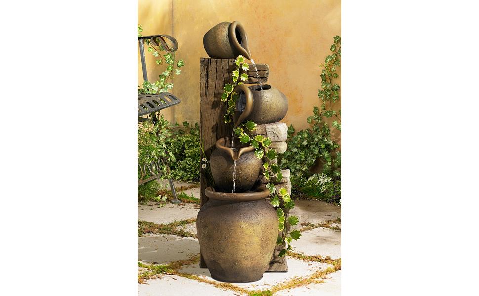 - Rustic fountain from John Timberland. Water cascades down three levels, creating a soothing, relaxing sound.