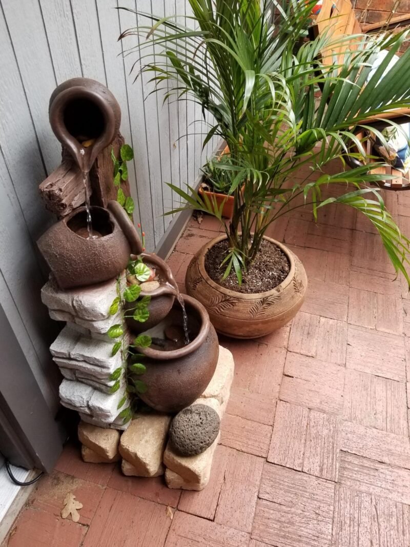 - Includes faux vine greenery, fountain water pump, and 9-foot cord. Plug-in fountain, easy to set-up and use.