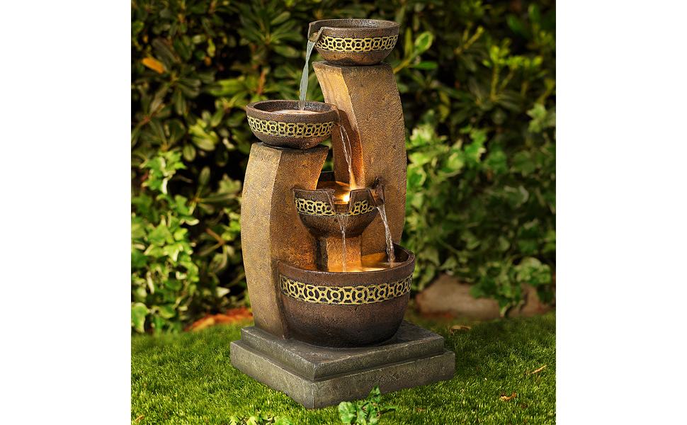 Sitting on arched pillars, this lovely high cascading fountain boasts four intricately designed bowls in a faux stone finish. Water gently pours into each pool, providing a soothing sound that’s enjoyable for indoor and outdoor areas. This beige and brown faux stone fountain also features LED lights designed to illuminate the flowing water at night. With lightweight construction and the flexibility to place it nearly anywhere in the home, this waterfall fountain will instantly enhance the serenity and beauty of any garden and living space.