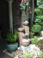 Four decorative bowls pour into one large basin to create this stunning beige and brown fountain that can be used in both indoor and outdoor areas.