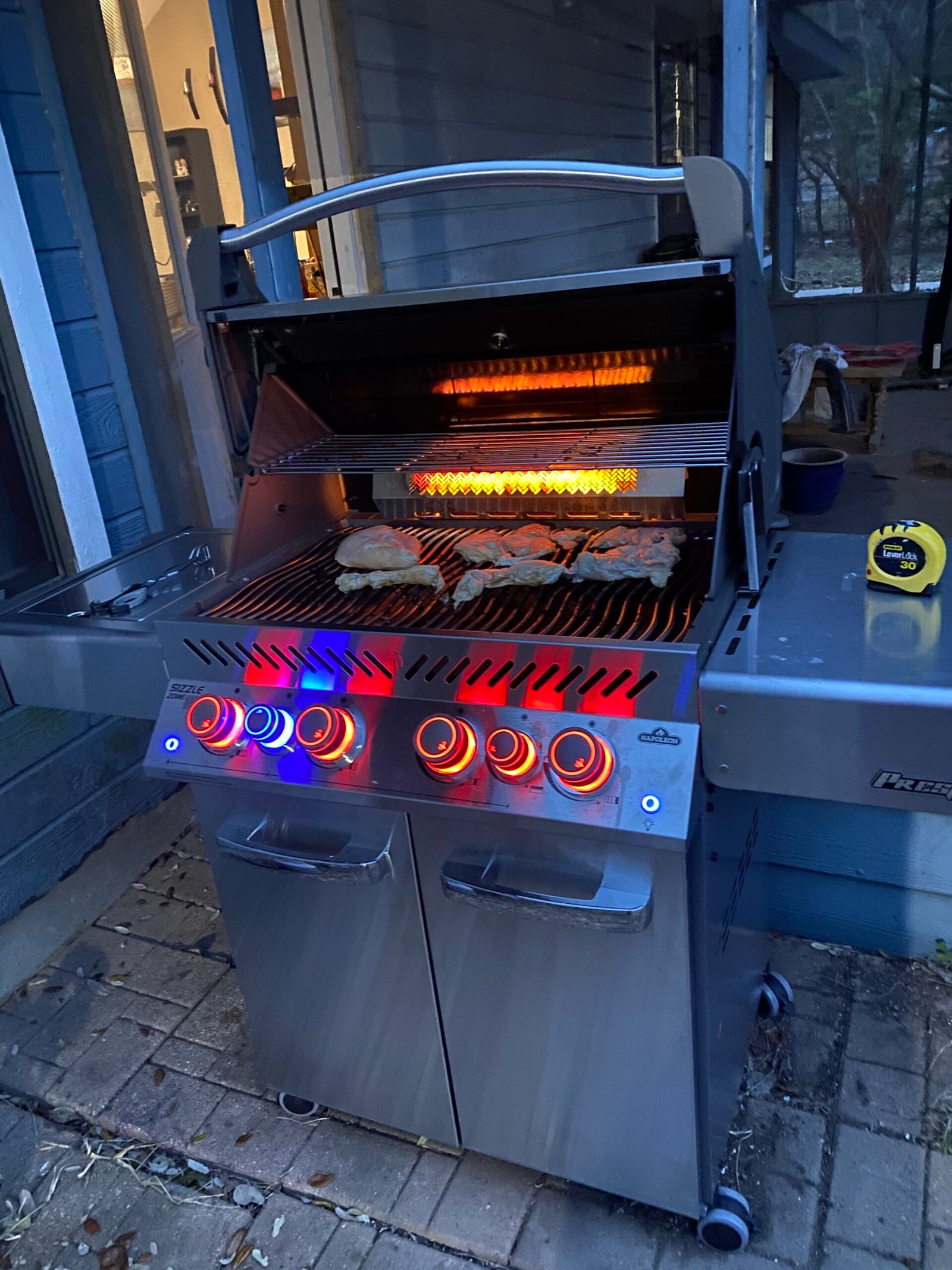 Enjoy rotisserie cooked food with the 18, 000 BTU Infrared rear burner and the Napoleon heavy duty rotisserie kit included with purchase. Why not get a bit creative with the Napoleon rotisserie basket perfect for rotisserie vegetables, fried or Chick wings.