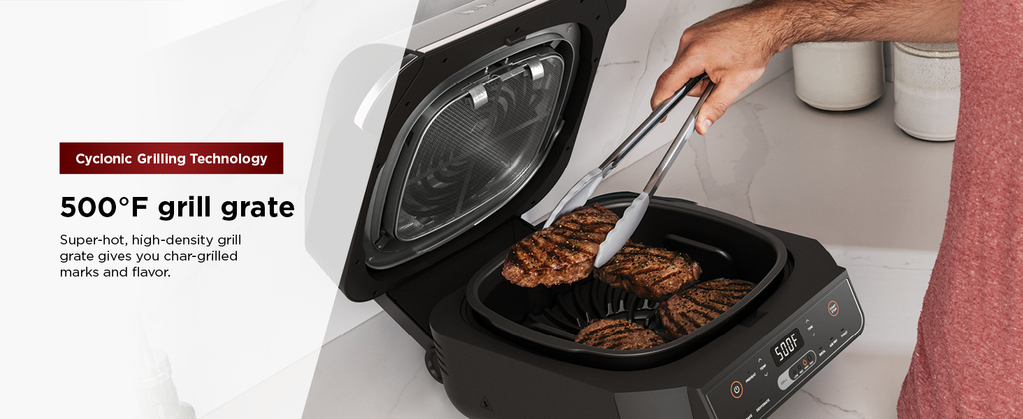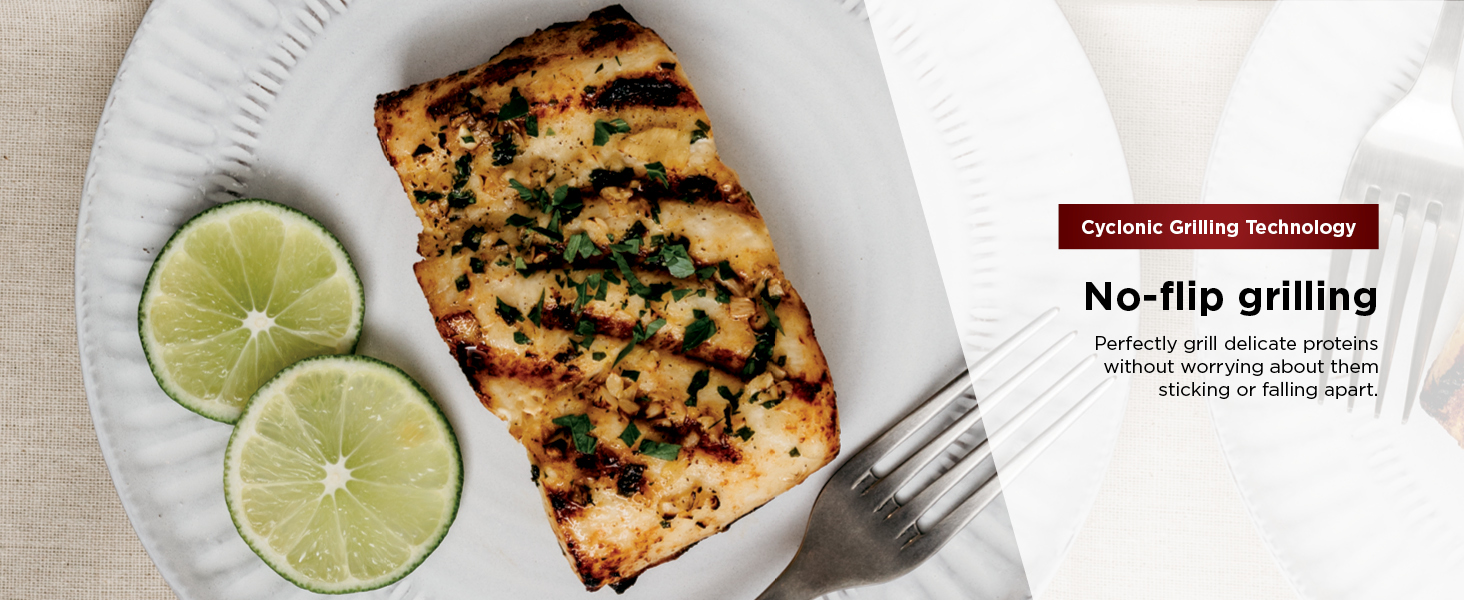 CYCLONIC GRILLING TECHNOLOGY: Uses 500°F cyclonic air to perfectly cook or char-grill your food to your desired doneness on the grill grate for delicious, char-grilled marks and flavors.