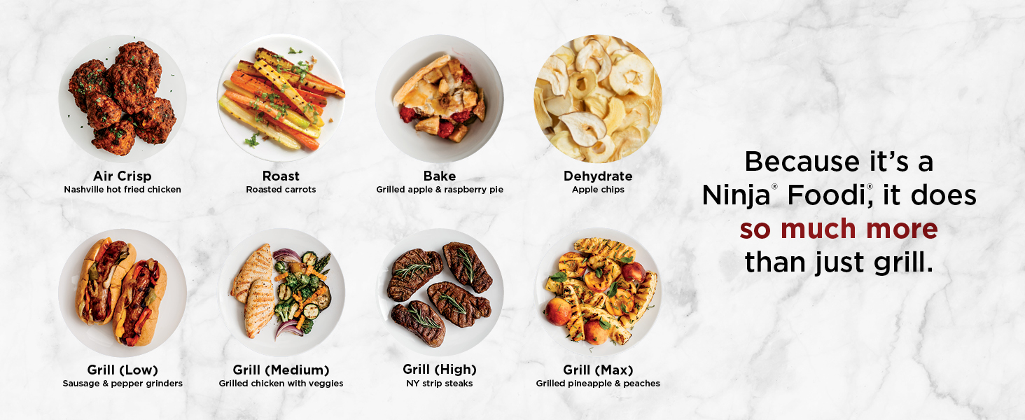 6 VERSATILE FUNCTIONS: Grill, Air Crisp, Roast, Bake, Broil, and Dehydrate functions enabled by wide temperature range.
