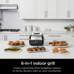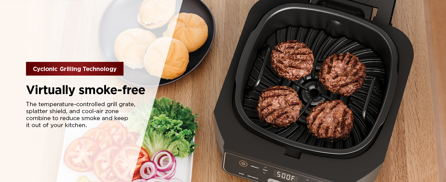 Meet the Ninja Foodi Indoor Grill. The grill that sears, sizzles, and air fry crisps. Updated sleek design from the original Foodi Grill. 500°F of hot cyclonic air for surround searing, while the 500°F high-density grill grate gives you delicious, char-grilled marks and flavor while being virtually smoke-free. It’s also an air fry crisper, allowing you to enjoy guilt-free fried food.