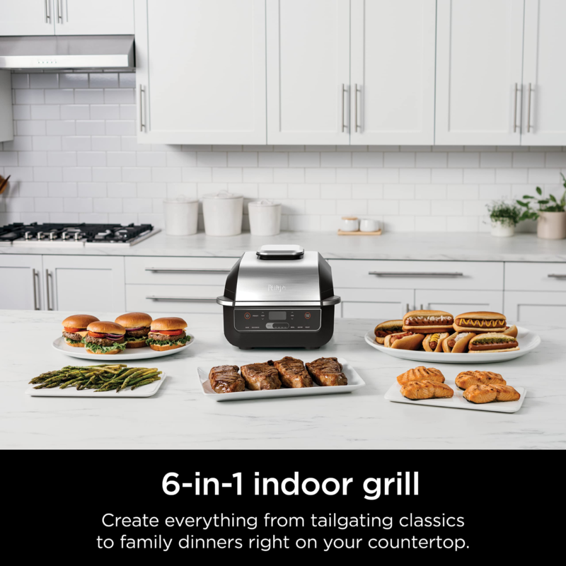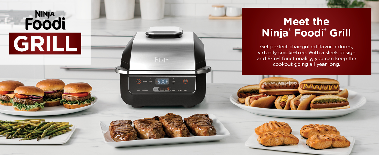 NINJA FOODI GRILL: The grill that sears, sizzles, and air fry crisps. New exterior look with all the great functions you love from the original Foodi Grill.