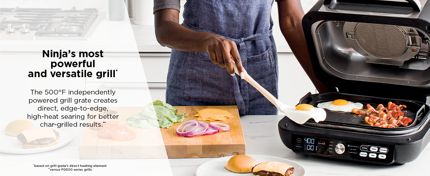 NINJA’S MOST POWERFUL GRILL: 500F independently powered grill grate creates direct, edge-to-edge high-heat searing for better char-grilled results. (Based on grill grate’s direct heating element Versus FG500-series grills.)