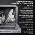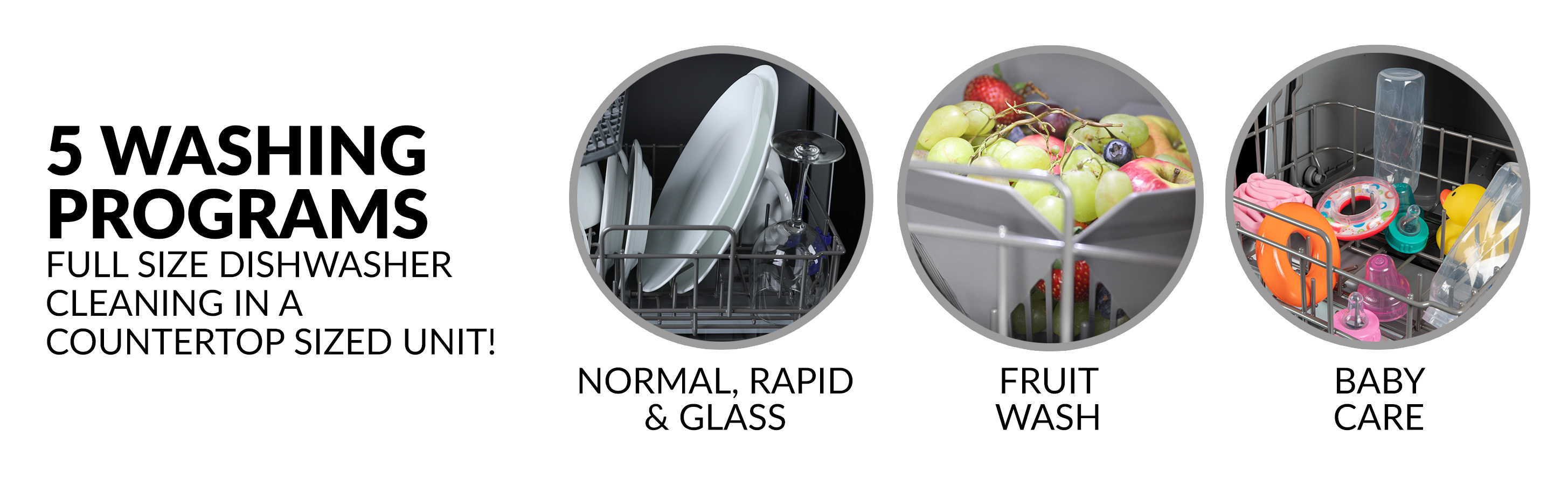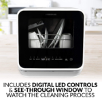 • FIVE WASHING PROGRAMS: You’ll get full size dishwasher cleaning in a countertop sized compact unit that offers five wash programs – Normal, Rapid, Fruit Wash, Baby Care and Glass. Lower and upper spray arms give dishes that streak-free deep cleaning