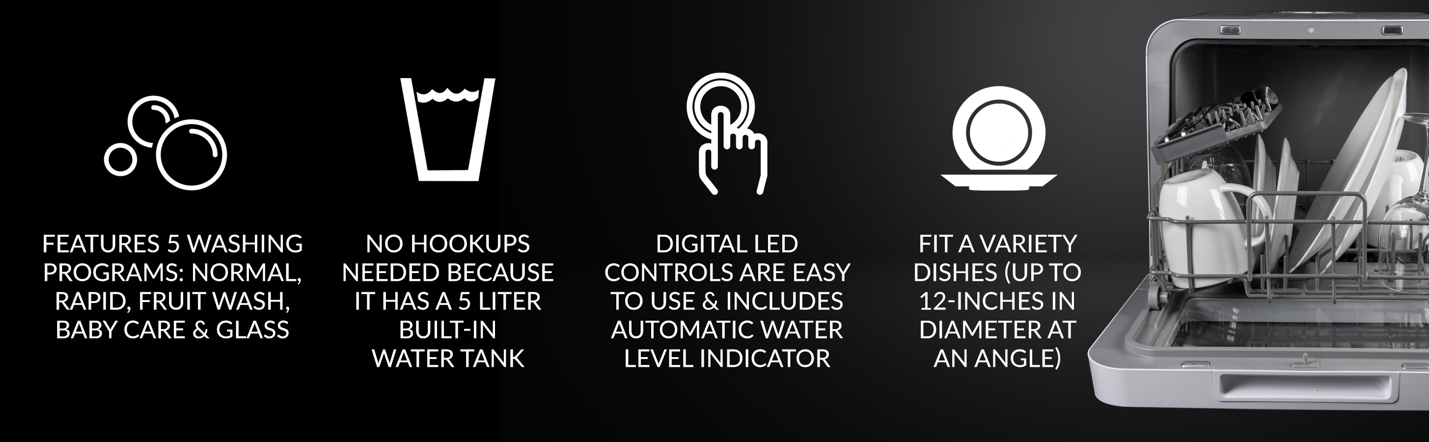 • QUALITY CONTROL NOTE All dishwashers are factory tested to ensure proper operation As a result it is normal for small amounts of residual water to be found in the unit .Can fit up to 12″ on Dishes and has 5-Liter Built-in Water Tank