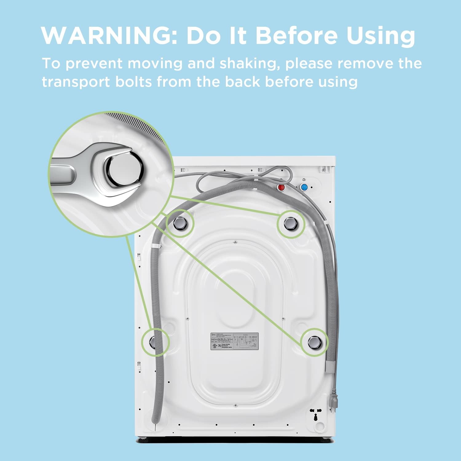 【Avoid Moving and Shaking】 Before using the washer and dryer combo. Please remove the transport bolts. 1. Loosen all bolts with a spanner and then remove them. 2. Cover the holes with transport hole plugs. 3. Keep the transport bolts for future use.