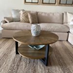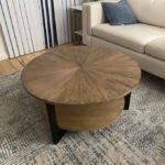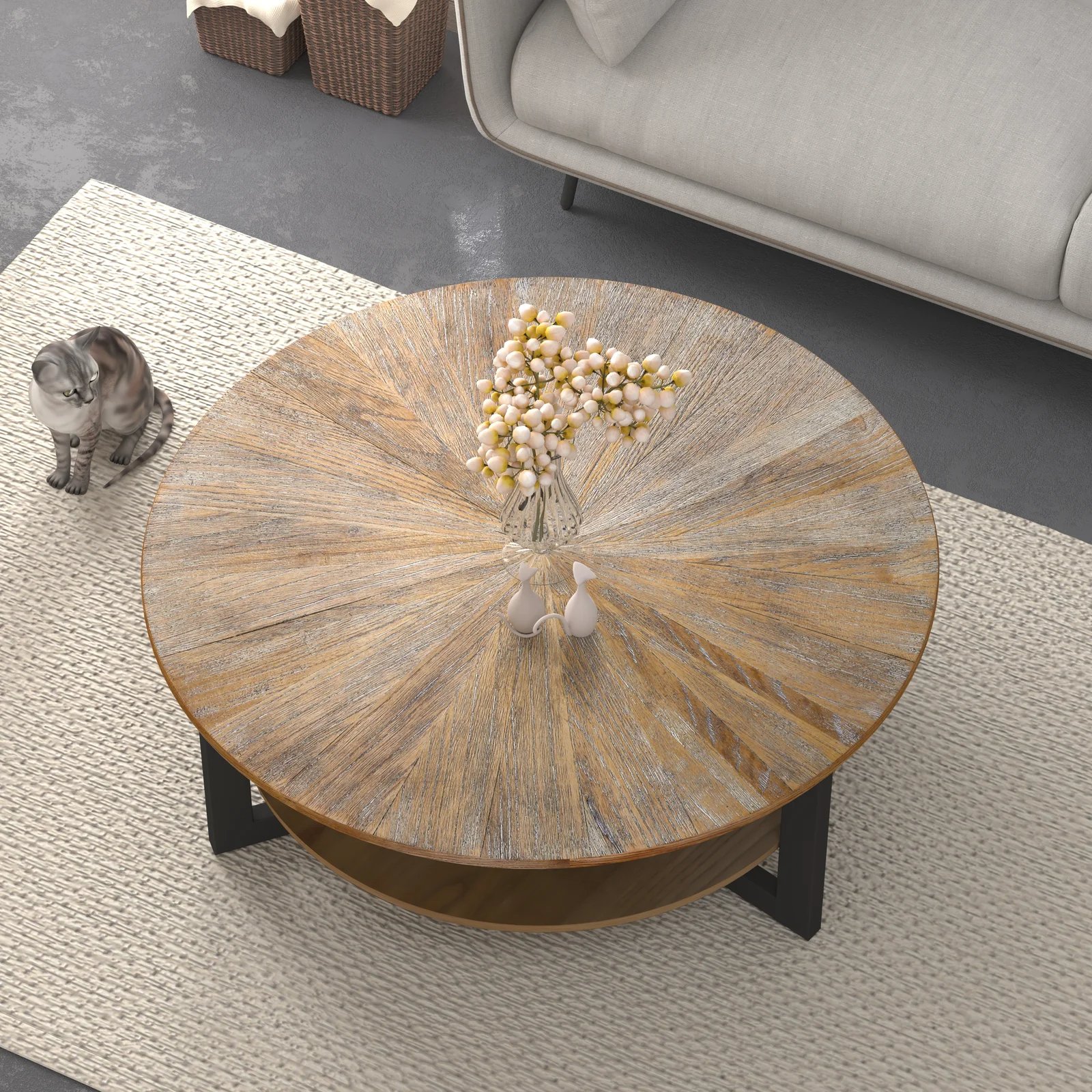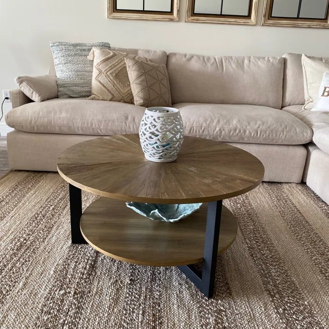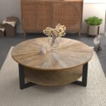 Product description :Our round coffee table provides an ideal spot to place your books, magazines, or fresh flowers upon with an urban industrial look. Metal legs wrap around the table top giving it structure and stability. Black painted metal make up the base, with natural wood grain finish detailing on the solid wood table top surface, for an overall rustic appeal perfect for your living room.