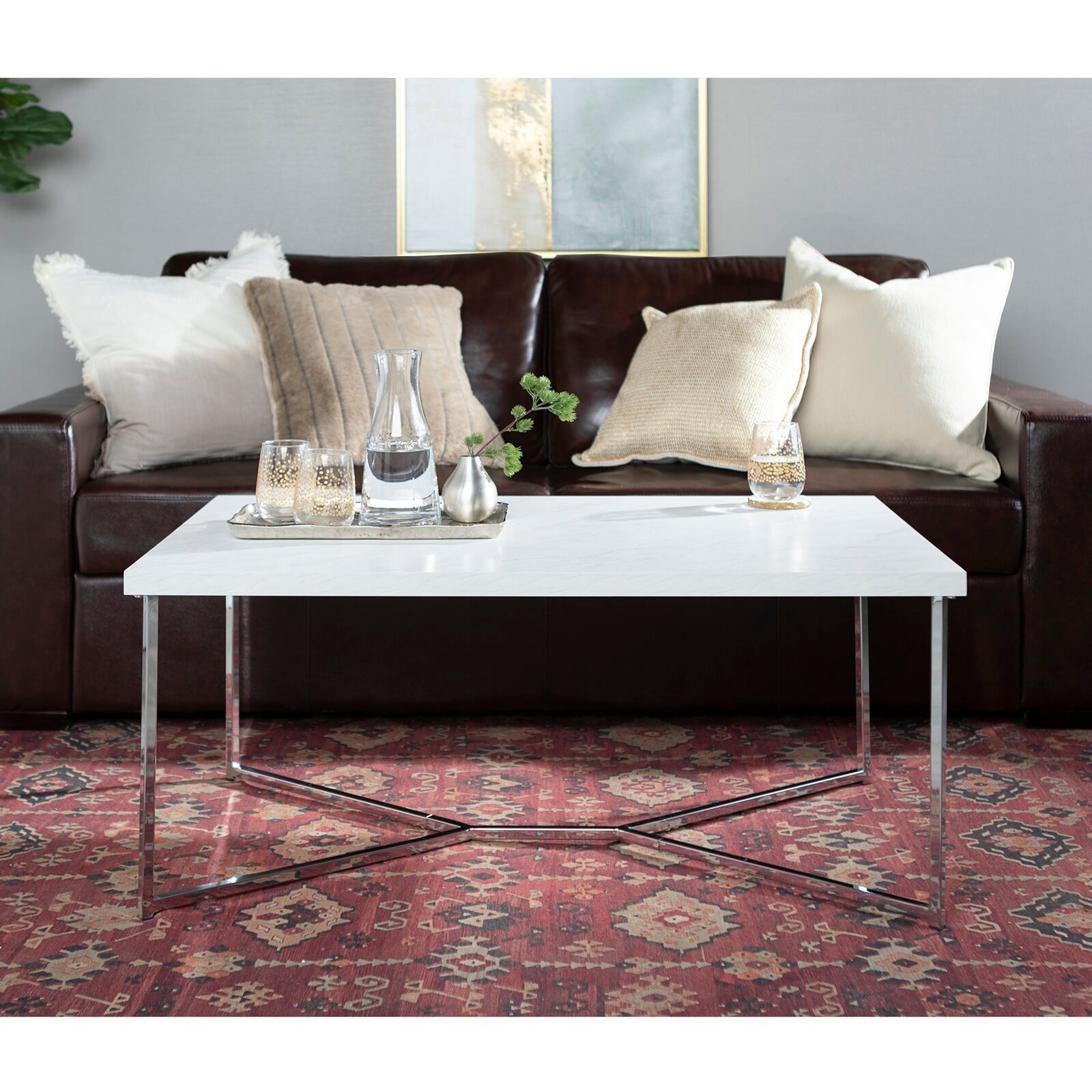 Whether the surface for a game night or just the perfect perch for keeping cups in easy reach, this coffee table is an essential place to gather in your living room ensemble. Crafted from metal, it features an X-shaped base with clean lines for a touch of contemporary appeal, while neutral hues allow it to blend with your color scheme. The manufactured wood top showcases a rectangular silhouette and can support up to 125 pounds after assembly.
