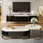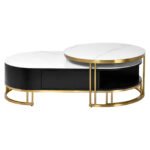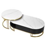This 2-piece nesting table set ties your living space together. Made from engineered wood, both pieces boast sleek, stainless steel legs and faux marble tops. This set features one larger, oval-shaped coffee table, and a circular nesting table that slides slightly above it. Store books, magazines, and living room clutter in the coffee table’s built-in storage space, and place beverages and display items on both tables’ surfaces. With their curved bases and metallic touches, these tables complement glam and contemporary decor styles alike.