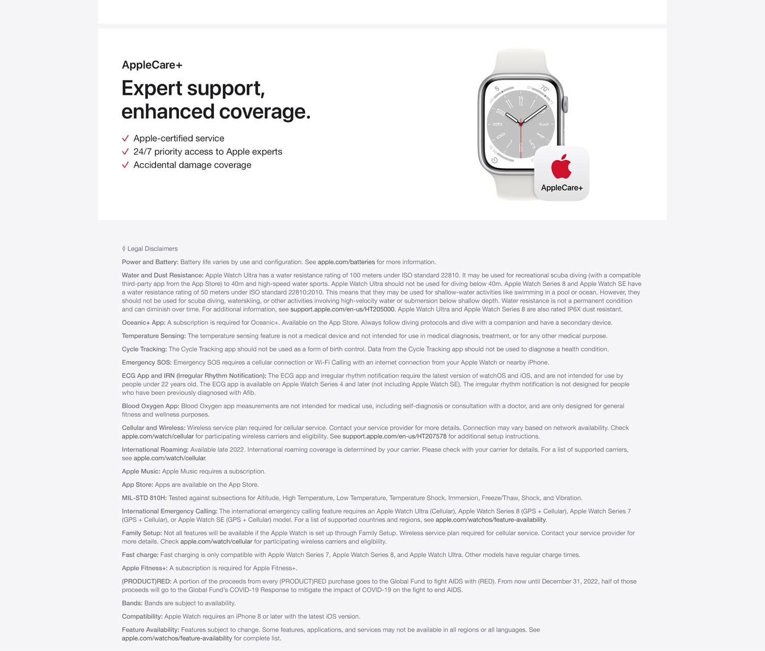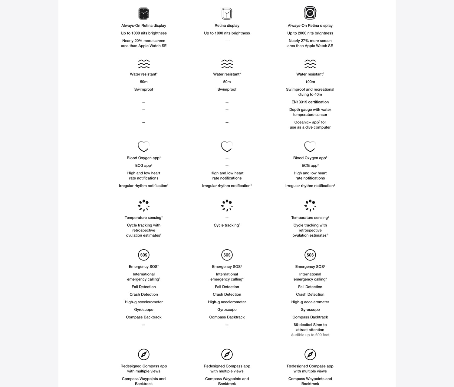 LTE and UTMS, Precision dual-frequency GNSS: GPS, GNSS, Galileo, BeiDou, S8 with 64-bit dual-core processor, W3 Apple wireless chip, U1 chip (Ultra Wideband), Always-on altimeter, Capacity 32GB, Blood oxygen sensor, Third-generation optical heart sensor, Electrical heart sensor, Certified IP6X dust resistant, High-g accelerometer, High-dynamic-range gyroscope, Ambient light sensor, Always-On Retina LTPO OLED flat sapphire crystal display (2000 nits), Digital Crown with haptic feedback, Dual speakers and three-microphone array, Flat sapphire crystal display, Wi-Fi 802.11b/g/n 2.4GHz and 5GHz, Bluetooth 5.3, Built-in rechargeable lithium-ion battery, Up to 36 hours of battery life (up to 60 hours on Low Power settings), Water resistant 100 meters, Swimproof and recreational diving to 40m