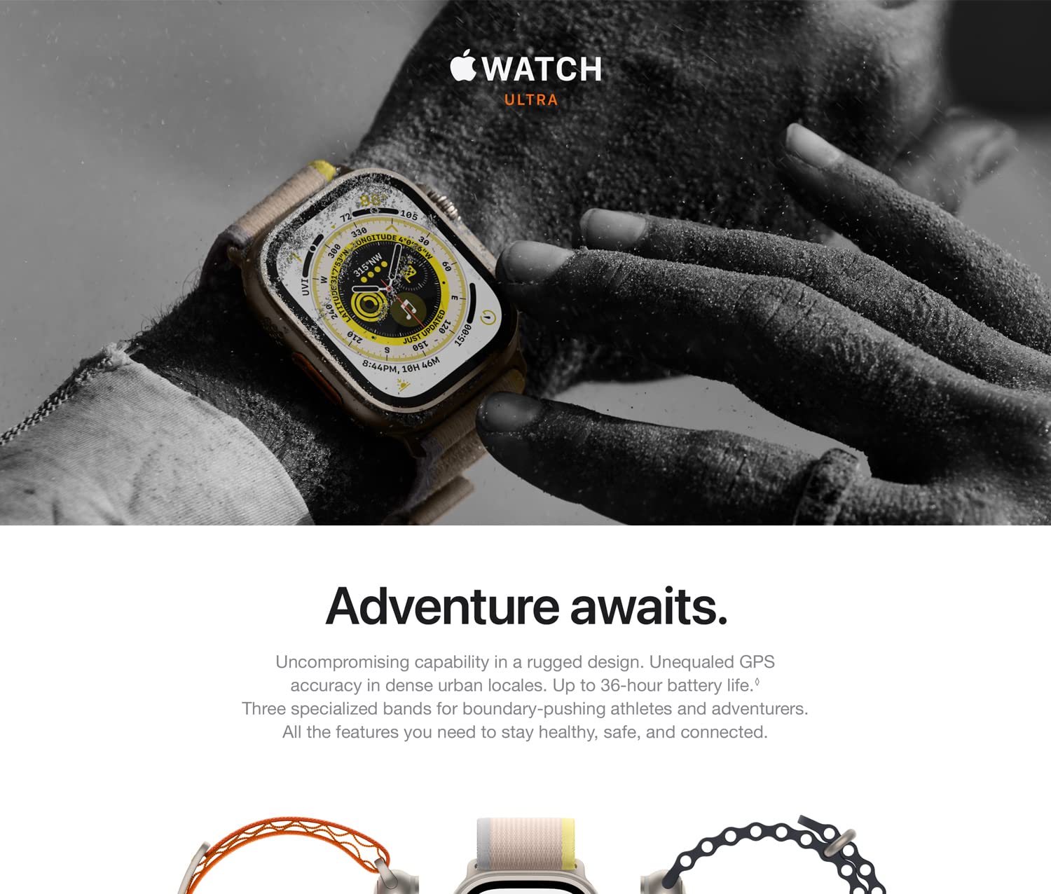 • WHY APPLE WATCH ULTRA — Rugged and capable, built to meet the demands of endurance athletes, outdoor adventurers, and water sports enthusiasts — with a specialized band for each. Up to 36 hours of battery life, plus all the Apple Watch features that help you stay healthy, safe, and connected.