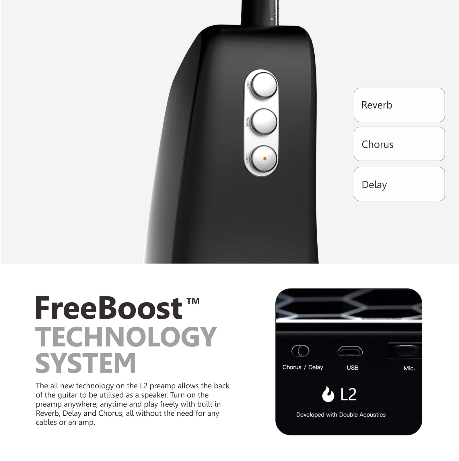 Play with Effects without Plugging In: The FreeBoost Technology on the L2 pickups uses rear surface of the LAVA ME as a speaker. Turn on the pickups anywhere anytime, you can freely play with reverb, delay, chorus without an amp. Percussion Effect: The L2 Pickup is now enabled with percussion sound receiving mic. It enhances and embellishes the percussion sound no matter if it is used with or without plugging it in.