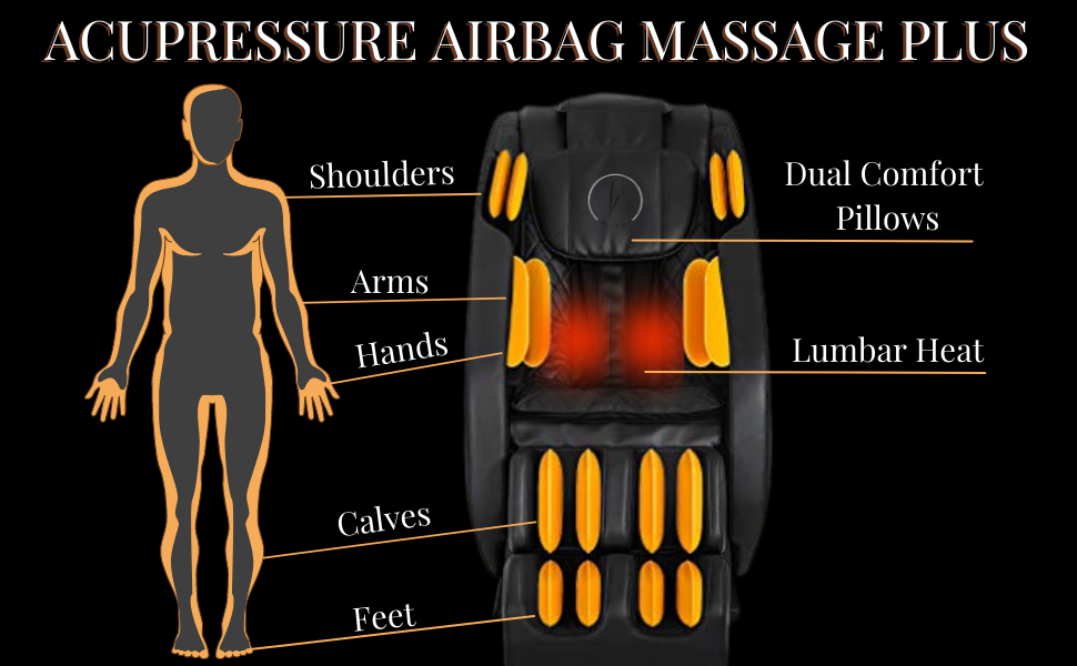- Acupressure Airbag Massage for the Calves, Feet, Hands, Arms, and Shoulders.