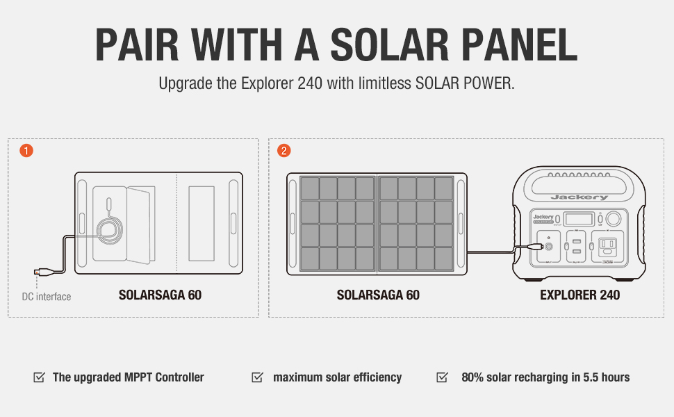 • GREEN POWER SUPPLY: The power station can be recharged by the Jackery SolarSaga 60 solar panel or SolarSaga 100 solar panel. Its built-in MPPT controller enables the solar panel to operate at its max power point for the power station to be recharged at its highest efficiency. TWO alternative ways to recharge: through the wall outlet or the car outlet.