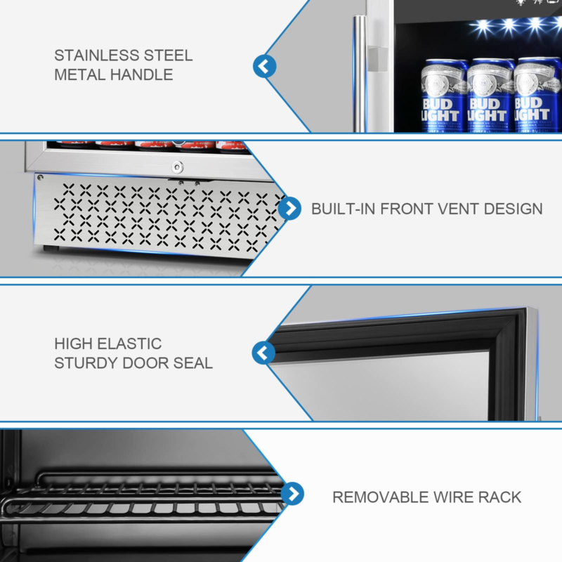 【Digital Display& Adjustable Shelf】Large display and white Led light to let you monitor the temperature and interior condition even in the dark. The beverage fridge’s shelf is removable so you can change the rows to accommodate different sizes of beverage.