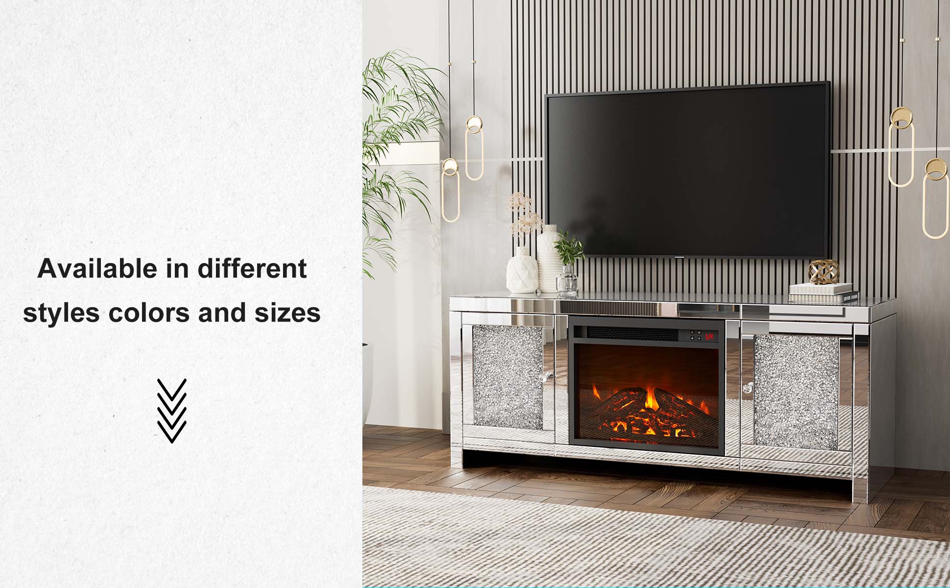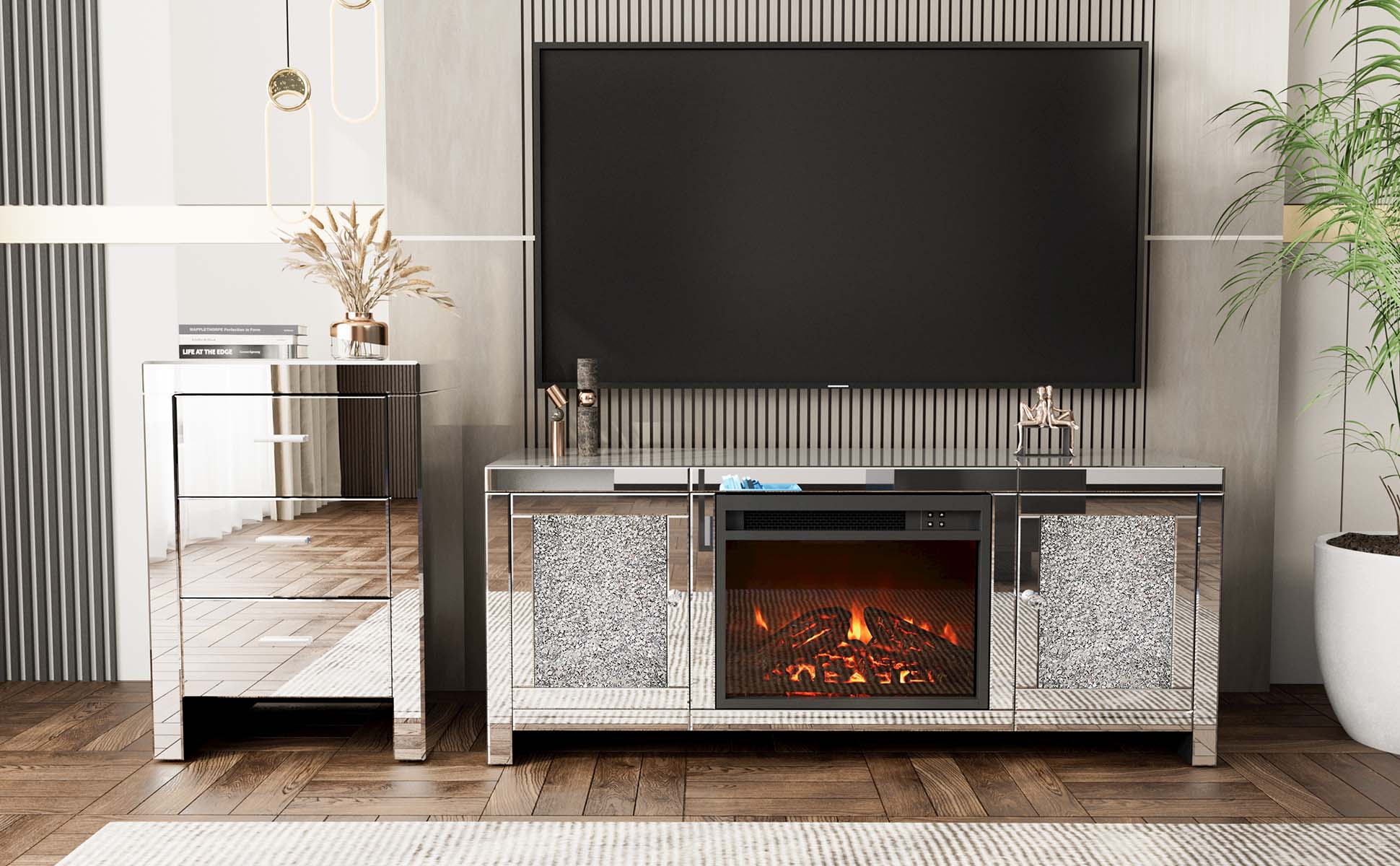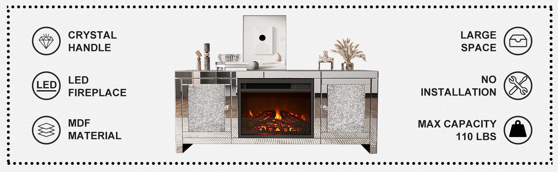 💎【High-Quality & Easy To Clean】The mirrored Fireplace TV Stand adopts high-Quality MDF board and smooth glass mirrored finish. A drawer with diamond handles for storage needs. Smooth surface of this Tv stand makes your cleaning more easier. The stains left on the tv stand can be quickly wiped, which also reduces your annoyance accordingly.